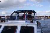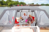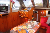 Weiterhin hat unser Boot eine Webasto Heizung, Echolot, Kompass, Bugstrahlruder, 220V und Inverter und einen Landanschluß. An Deck haben wir eine Persenning mit Sonnensegel und natürlich Tisch und Stühle.